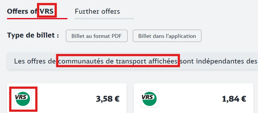 Pour s’orienter, il est aussi possible de vérifier dans DB Navigator ou sur le site de la DB si des billets de réseau sont vendus pour un trajet. Ceux-ci sont indiqués comme Verbund-Angebote, avec le logo et sous les offres du [nom du réseau].